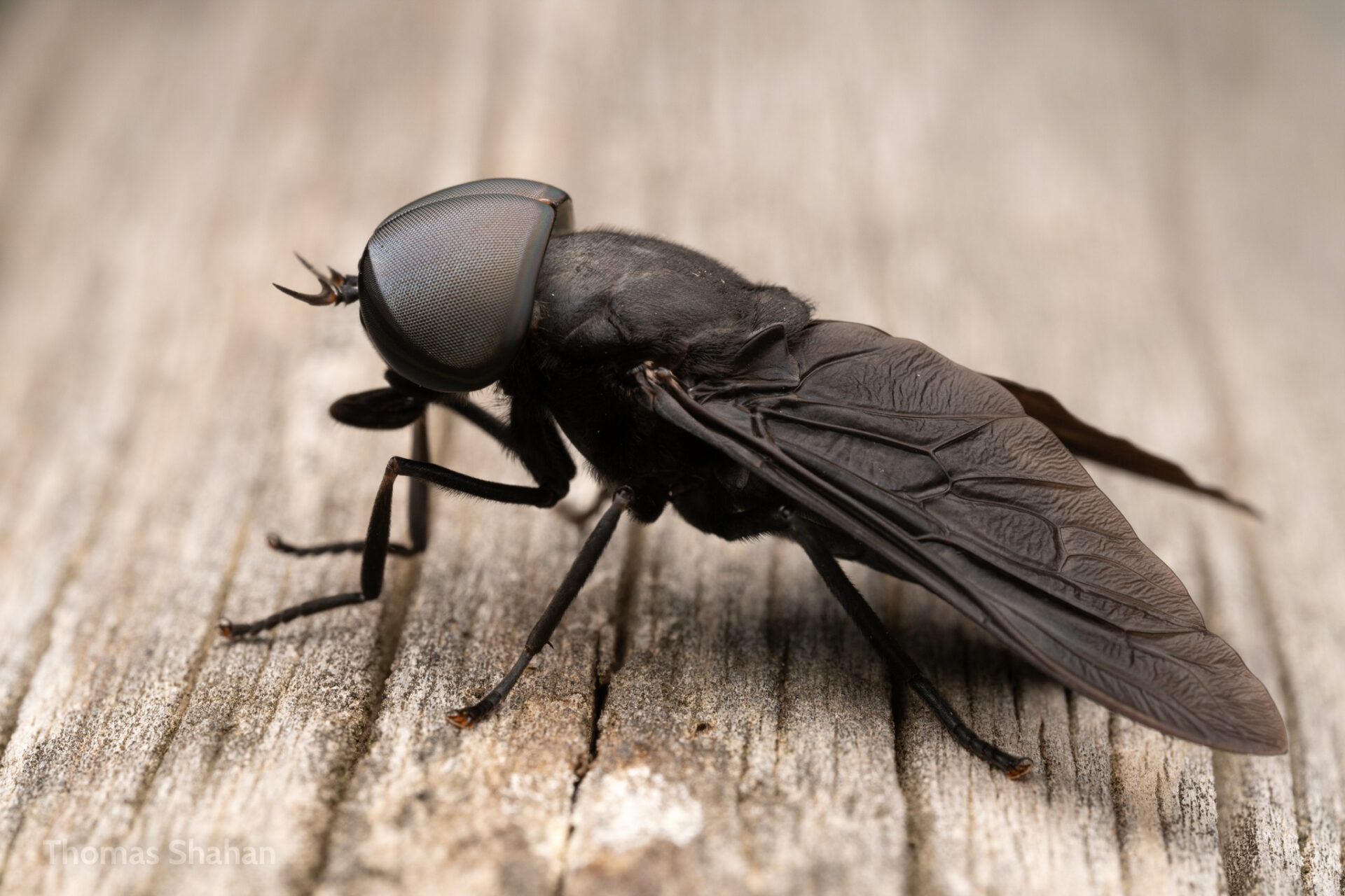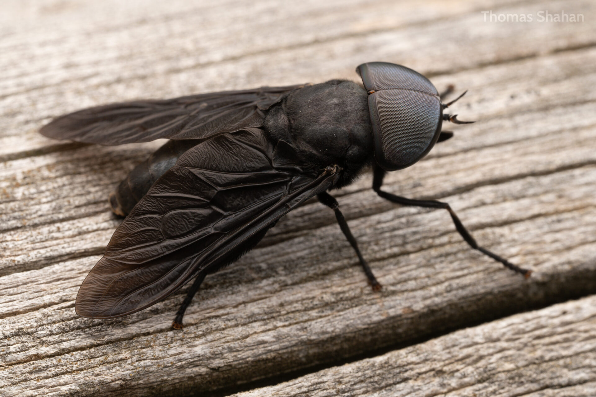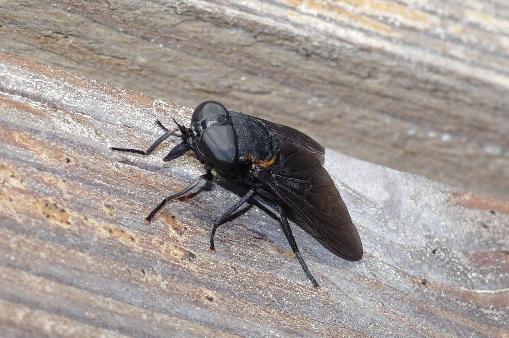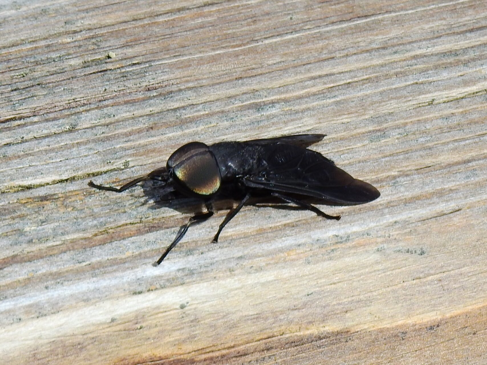 Notable behavior: Only female Black Horse Flies bite, requiring protein-rich blood meals for egg development, while males content themselves with nectar and plant juices.