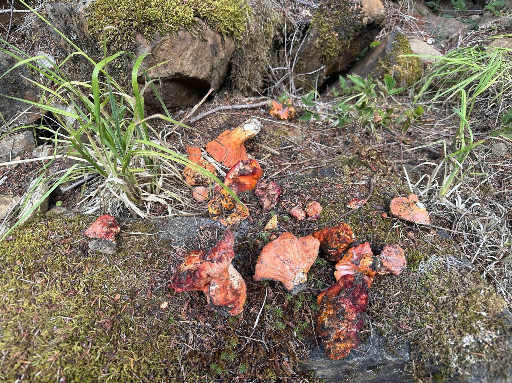 The transformed fruiting body blazes with vibrant orange to reddish-orange coloration that immediately calls to mind a cooked lobster shell. This brilliant hue covers the entire surface, from what was once the cap down to the base of the stem. The original gills of the host mushroom become completely obscured, replaced by a bumpy, irregular surface dotted with tiny pores where the parasitic fungus releases its spores.